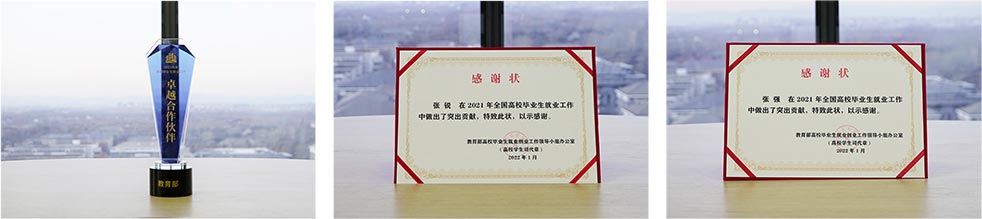 2021年,万学在高校毕业生就业工作方面贡献卓越,获教育部颁发“卓越合作伙伴”荣誉奖杯,并为mk体育董事长张锐、执行总裁张强颁发感谢状。