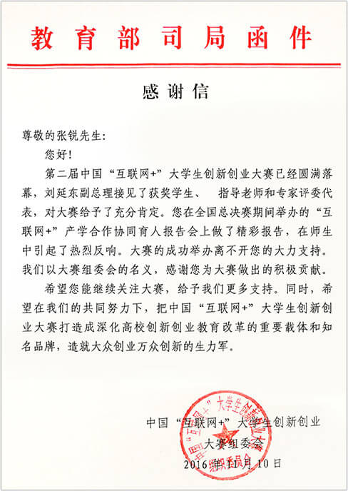 • 2018年,mk体育连续多年为中国国际互联网+大学生创新创业大赛做出积极贡献,获教育部来函致谢。